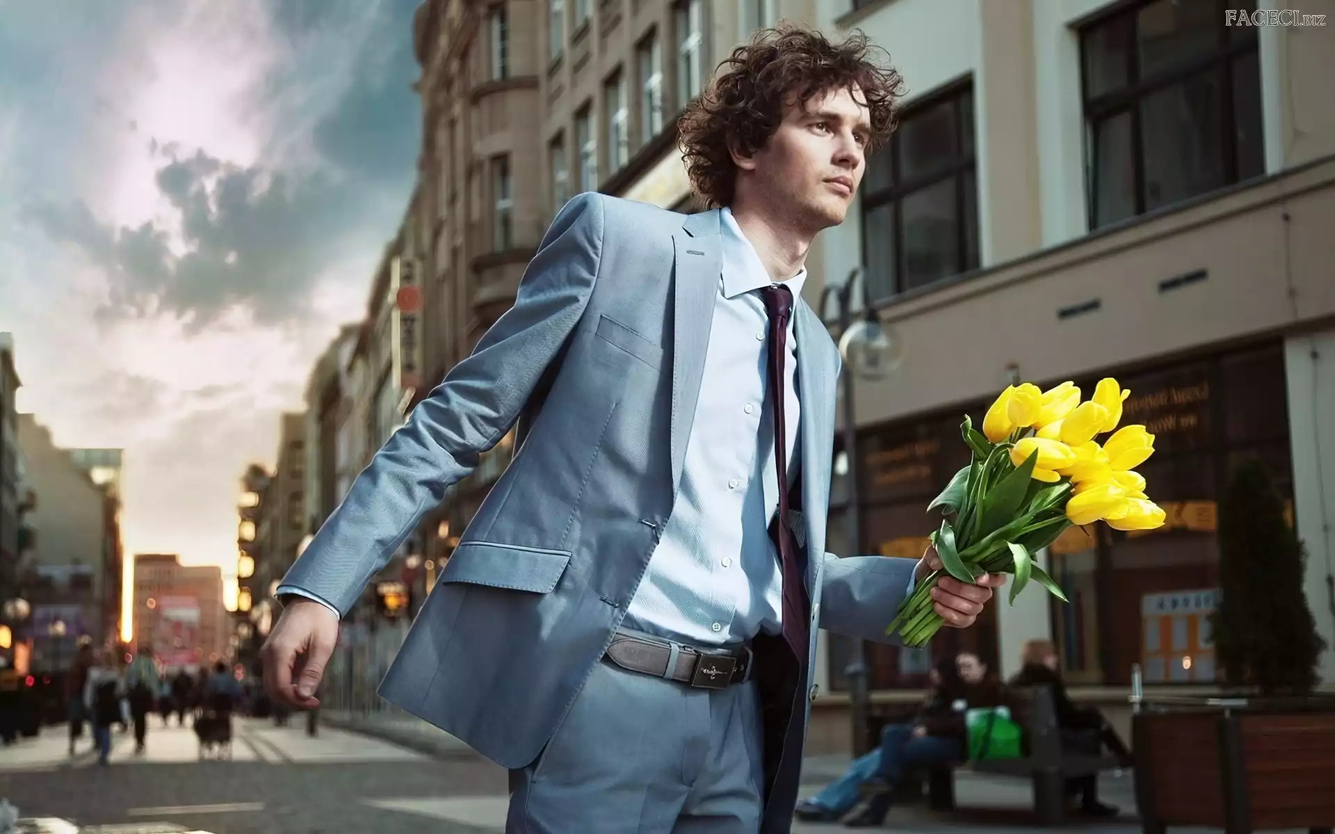 Mężczyzna, Miasto, Tulipany, Żółte, Ulica, Garnitur - faceci.biz